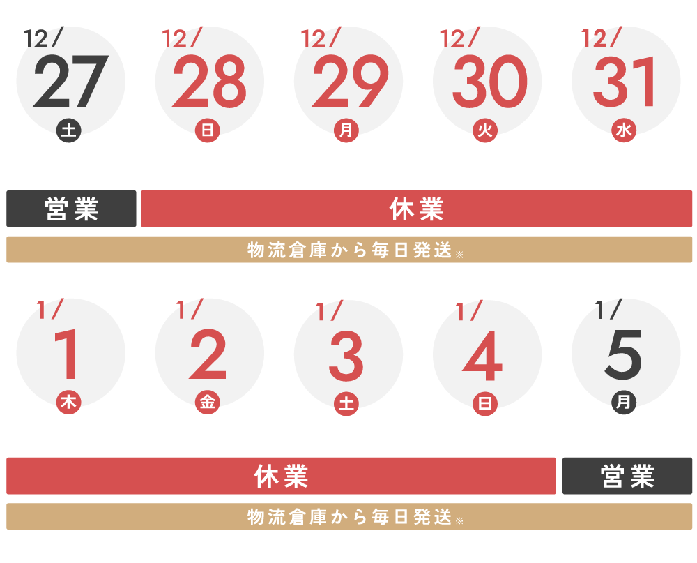 ※ 但し、備考欄への記載があるなど、個別に対応が必要なご注文につきましては、 1/5(月)以降 の対応となります。